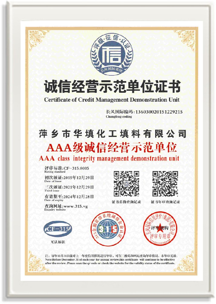 萍鄉(xiāng)市華填化工填料有限公司,位于320國道、109國道、浙贛鐵路、昌金高速公路貫穿其中,交通便利,是江西西部一顆燦爛明珠,創(chuàng)建于20世紀(jì)70年代初期,是中國石油天然氣股份有限公司“能源一號網(wǎng)”會員企業(yè)、中國石化物資采購電子商務(wù)網(wǎng)絡(luò)和中國海洋石油總公司采辦業(yè)務(wù)系統(tǒng)成員單位,是上海大學(xué)江西材料基因組工程產(chǎn)業(yè)研究院工業(yè)陶瓷產(chǎn)業(yè)創(chuàng)新聯(lián)盟基地,且通過ISO9001:2015質(zhì)量管理體系、ISO14001:2015環(huán)境管理體系、ISO45001:2018職業(yè)健康安全管理體系認(rèn)證的化工填料生產(chǎn)企業(yè)。公司擁有陶瓷、塑料、金屬填料、催化劑、活性氧化鋁、分子篩等產(chǎn)品生產(chǎn)線,現(xiàn)有固定資產(chǎn)3616萬元,占地面積3.8萬平方米。公司具有悠久的生產(chǎn)歷史、雄厚的技術(shù)力量和先進(jìn)的生產(chǎn)工藝設(shè)備,可生產(chǎn)工業(yè)瓷球(支撐劑)、陶瓷、金屬、塑料質(zhì)的規(guī)整、散堆化工填料及分子篩、催化劑、生化濾料、活性氧化鋁、石化助劑、活性炭、環(huán)保材料、耐火材料等系列的200多種規(guī)格型號產(chǎn)品。